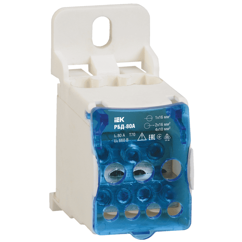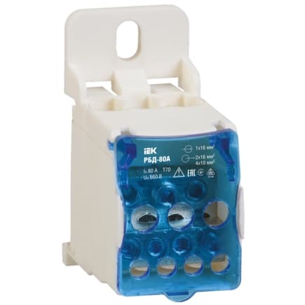 Распределительные блоки РБД предназначены для использования в качестве клеммного зажима при подключении к проводнику большего сечения нескольких проводников меньшего сечения, для создания упорядоченных систем распределения в шкафах, для организации главной заземляющей шины.Предназначены для монтажа на DIN-рейку или на монтажную панель как в силовых шкафах, так и в квартирных распределительных щитах, для работы в сетях с напряжением до 1000 В частоты 50 Гц при температуре окружающего воздуха от 40 до +70 С.Распределительные блоки РБД изготовлены из высококачественной латуни с нанесенным специальным защитным покрытием. Корпус выполнен из негорючего пластика. Способы установки: на монтажную DIN-рейку 35 мм, на панель щита двумя винтами.