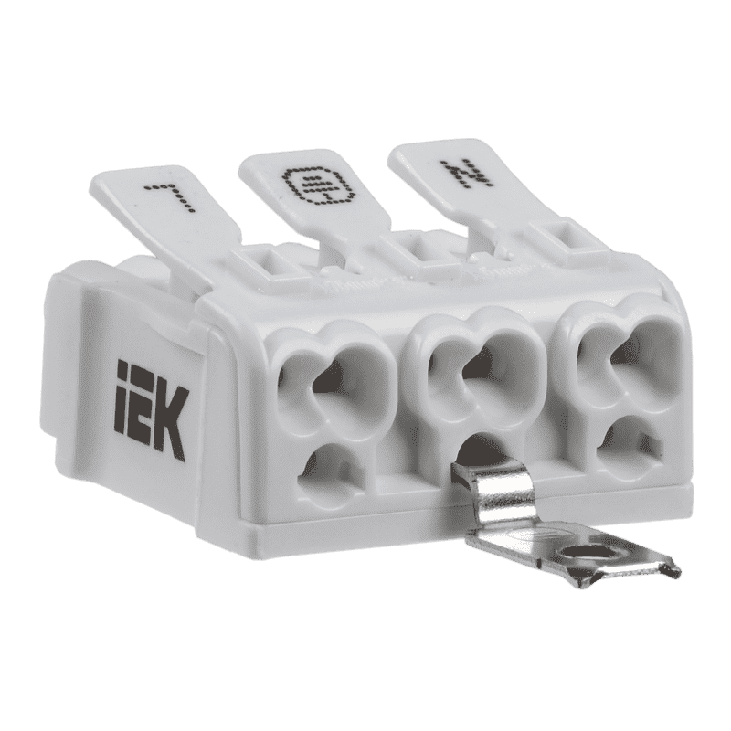 Клеммы пружинные соединительные КСП торговой марки IEK предназначены для присоединения и ответвления одножильных и многожильных медных проводников в электрических цепях переменного тока напряжением до 450 В частоты 50 Гц при температуре окружающего воздуха от минус 60 до плюс 40 С.В зависимости от своей конфигурации, клеммы КСП IEK включают в себя типовые схемы подключения фазных проводников, нулевого рабочего и защитного проводников, объединенные в единый корпус.Все клеммы КСП IEK снабжены самонажимными и нажимными контактами, отдельные модели клемм КСП имеют монтажную ножку, внешний металлический винтовой контакт заземления, или оба приспособления одновременно. Быстрое и надежное соединение проводников без применения профессионального инструмента и специальных навыков.От двух до пяти входных отверстий в одном корпусе.Каждая клемма имеет маркировку на подвижной части для удобства монтажа.Наличие отверстий в верхней части корпуса клеммы для измерения электрических параметров цепи без отсоединения.